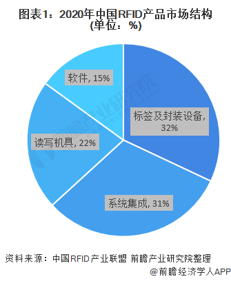 RFID系統(tǒng)包括標(biāo)簽及封裝、讀寫器、軟件和系統(tǒng)集成服務(wù),軟件包括中間件和應(yīng)用系統(tǒng)。據(jù)中國RFID產(chǎn)業(yè)聯(lián)盟數(shù)據(jù)顯示,目前,我國標(biāo)簽及封裝產(chǎn)品市場(chǎng)在RFID系統(tǒng)中所占的比重最大,未來軟件和系統(tǒng)集成的規(guī)模會(huì)進(jìn)一步提高。2020年,標(biāo)簽及封裝市場(chǎng)的比重約為32%,系統(tǒng)集成服務(wù)占31%,讀寫器占22%,軟件占15%。
