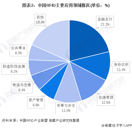 隨著中國經(jīng)濟(jì)的高速發(fā)展,RFID技術(shù)在物流、零售、制造業(yè)、服裝業(yè)、醫(yī)療、身份識(shí)別、防偽、資產(chǎn)管理、交通、食品、動(dòng)物識(shí)別、圖書館、汽車、航空、軍事等其他領(lǐng)域都將發(fā)揮越來越重要的作用。其中,金融支付占據(jù)21.2%的市場(chǎng),成為了中國RFID行業(yè)市場(chǎng)第一板塊。其次在身份識(shí)別、交通管理和軍事與安全的應(yīng)用也占據(jù)了10%以上的市場(chǎng)份額。
