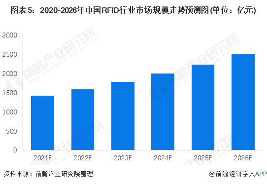 雖然RFID在國內(nèi)起步比較晚,但需求有快速發(fā)展趨勢(shì)。新冠疫情影響,全國經(jīng)濟(jì)受到較大沖擊,預(yù)計(jì)2020年我國RFID產(chǎn)業(yè)規(guī)模不會(huì)出現(xiàn)大幅增長的現(xiàn)象。長期來看,疫情過后,中國整體經(jīng)濟(jì)向好的趨勢(shì)將不會(huì)改變,預(yù)計(jì)2021-2025年均復(fù)合增長率仍然維持在12%左右,主要的增長動(dòng)力來源于社??ê徒】悼?xiàng)目、交通管理、移動(dòng)支付、物流與倉儲(chǔ)、防偽、金融IC卡遷移等細(xì)分領(lǐng)域。前瞻初步估算到2026年我國RFID的市場(chǎng)規(guī)模將接近2500億元。