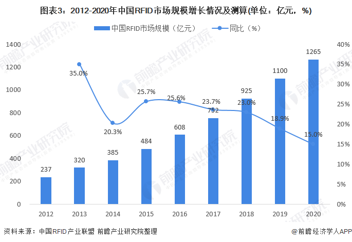 根據(jù)中國RFID產(chǎn)業(yè)聯(lián)盟,自2010年中國物聯(lián)網(wǎng)發(fā)展被正式列入國家發(fā)展戰(zhàn)略后,中國RFID行業(yè)及物聯(lián)網(wǎng)產(chǎn)業(yè)迎來了難得的發(fā)展機(jī)遇。2013年,我國RFID的市場(chǎng)規(guī)模突破300億元,規(guī)模增速達(dá)到35.0%,隨后市場(chǎng)平穩(wěn)上升;2019年,中國整體宏觀環(huán)境遇冷,下游需求受到影響,市場(chǎng)增速有所下降,但整體仍保持上升勢(shì)頭,市場(chǎng)規(guī)模在1100億元左右。2020年,基于RFID技術(shù)的物聯(lián)網(wǎng)應(yīng)用更不斷豐富,與移動(dòng)互聯(lián)網(wǎng)的結(jié)合不斷深入,應(yīng)用領(lǐng)域不斷廣泛,RFID市場(chǎng)規(guī)模將繼續(xù)保持高速增長趨勢(shì),2020年末我國RFID市場(chǎng)規(guī)模突破1200億元。