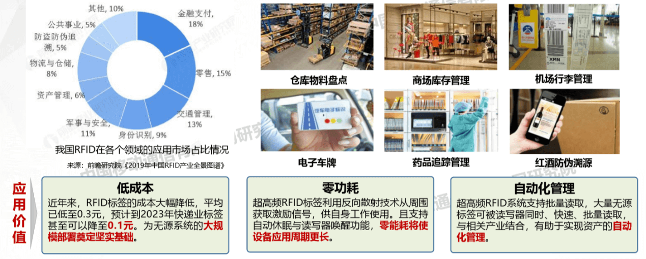 在成本方面,近年來(lái)RFID標(biāo)簽的成本大幅降低,平均已低至0.3元,預(yù)計(jì)到2023年快遞業(yè)標(biāo)簽甚至可以降至0.1元,為無(wú)源系統(tǒng)的大規(guī)模部署奠定堅(jiān)實(shí)基礎(chǔ);零功耗方面,超高頻RFID標(biāo)簽利用反向散射技術(shù)從周圍獲取激勵(lì)信號(hào),供自身工作使用,且支持自動(dòng)休眠與讀寫器喚醒功能,零能耗將使設(shè)備應(yīng)用周期更長(zhǎng);自動(dòng)化管理方面,超高頻RFID讀寫器支持批量讀取,大量無(wú)源標(biāo)簽可被RFID讀寫器同時(shí)、快速、批量讀取,與相關(guān)產(chǎn)業(yè)結(jié)合,有助于實(shí)現(xiàn)資產(chǎn)的自動(dòng)化管理。