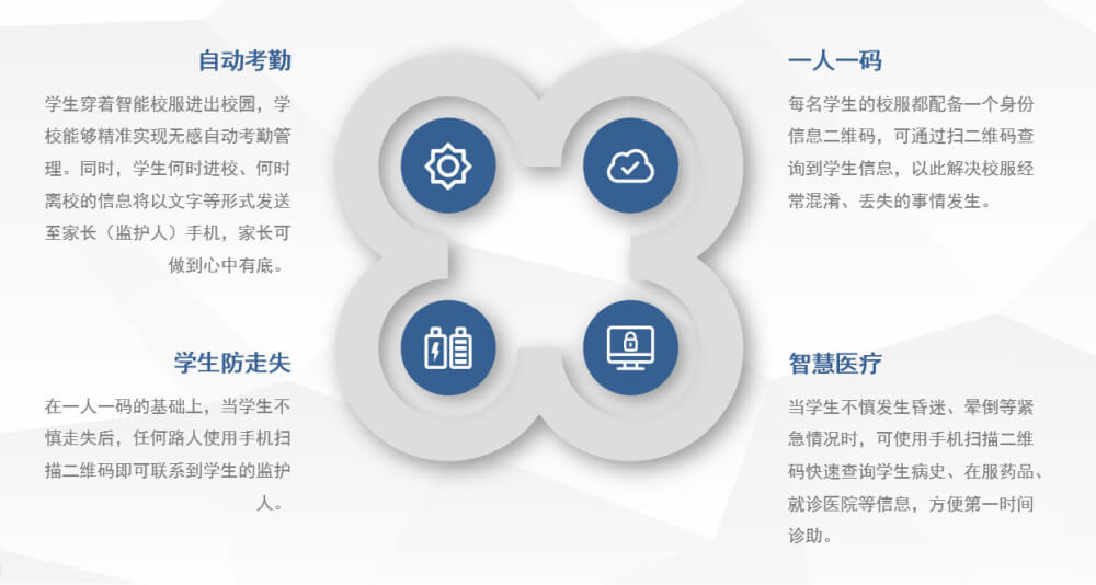 當(dāng)學(xué)生穿上校服進入校園,RFID技術(shù)則又是另一種景象。學(xué)生穿著智能校服通過RFID通道門,RFID設(shè)備會快速讀取學(xué)生考勤信息,結(jié)合人臉識別攝像頭同時實現(xiàn)無感考勤。同時,學(xué)生何時進校、何時離校的信息也都會記錄在系統(tǒng),主動推送給家長老師,達到考勤目的。智能校服可為每一名學(xué)生打造專屬標識,家長只需通過手機NFC,即可一眼識別校服持有者,便于校服丟失尋回,混淆時區(qū)分辨識。當(dāng)學(xué)生發(fā)生諸如昏迷、暈倒等緊急情況時,智能校服內(nèi)的RFID芯片能快速了解學(xué)生病史、在服藥物等信息,方便第一時間實施搶救、治療,具有醫(yī)療救助功能。
