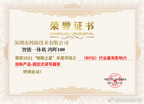 2022年3月16日,深圳鴻陸技術(shù)有限公司憑借著絕對(duì)的實(shí)力榮獲了“2021中國(guó)RFID行業(yè)最有影響力固定式讀寫(xiě)器創(chuàng)新產(chǎn)品獎(jiǎng)”及“2021中國(guó)RFID行業(yè)年度最有影響力系統(tǒng)集成企業(yè)”兩項(xiàng)大獎(jiǎng)。其中,“2021中國(guó)RFID行業(yè)最有影響力固定式讀寫(xiě)器創(chuàng)新產(chǎn)品獎(jiǎng)”的獲獎(jiǎng)產(chǎn)品即是——鴻陸的智能一體機(jī) 鴻暉100。