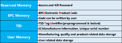 Reserved(保留),EPC(電子產品代碼),TID(標簽識別號)和User(用戶)四個獨立的存儲區(qū)塊(Bank)