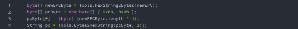 EPC區(qū):是識別標簽對象的電子產品碼,EPC與TID相比,區(qū)別在于EPC可以用戶手動寫入修改。EPC區(qū)的數據結構是,第一個word是校驗位,第二個word是長度控制,之后的才是數據存儲位置,盤存的時候,是根據長度控制位所表示的長度來顯示EPC的。實際寫入EPC數據的時候,起始地址填1,即從長度控制位開始寫入數據,校驗位會自動計算不用手動寫入。長度控制位計算: EPC數據長度 * 2 = i; 將i轉換為十六進制表示,然后在轉換后的結果后面加00,最終得到的就是長度控制位的數據。如:0001, i = 4 * 2 = 8 —> 08 —>0800,長度控制位為0800,程序中計算: