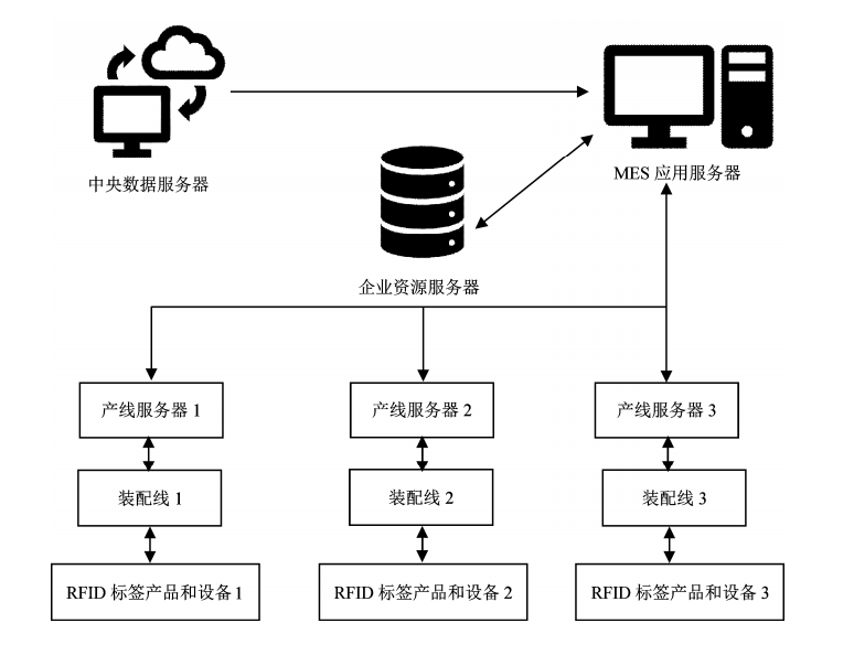 在具體應(yīng)用方面,通過在生產(chǎn)線相應(yīng)的工位處安裝固定式RFID閱讀器或手持式讀寫器實時采集生產(chǎn)線的零件信息,并通過現(xiàn)場控制器實現(xiàn)與機器人等現(xiàn)場設(shè)備的實時通訊?,F(xiàn)場采集的數(shù)據(jù)通過車間現(xiàn)場總線傳輸?shù)杰囬g服務(wù)器進行數(shù)據(jù)處理和分析,同時跟MES應(yīng)用服務(wù)器進行交互,而中央數(shù)據(jù)服務(wù)器作為數(shù)據(jù)匯總和備份的終端,獲得生產(chǎn)數(shù)據(jù)匯總,必要時MES服務(wù)器可以從中提取數(shù)據(jù)。最終通過中心服務(wù)器將各個生產(chǎn)現(xiàn)場的數(shù)據(jù)匯總到企業(yè)管理信息系統(tǒng)。