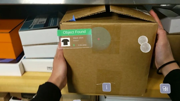 此外,該頭顯還配備具有射頻(RFID)感應(yīng)功能的 AR-conformal 寬帶天線,通過將天線與頭顯攝像頭配合使用,運(yùn)行基于 AR 的 SAR 定位算法,即使通過紙板箱和塑料容器等特定材料也能識別帶有RFID電子標(biāo)簽的物體,甚至可以穿過紙板箱和塑料箱等特定材料。