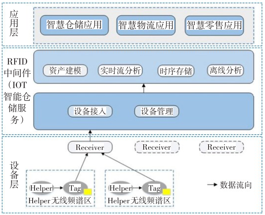 基于IOT和分布式RFID網(wǎng)絡(luò)構(gòu)建了智能倉儲(chǔ)基礎(chǔ)設(shè)施,倉儲(chǔ)管理的核心就是貨物數(shù)據(jù)的采集、加工、分析和展示?;贗OT和RFID收發(fā)分離技術(shù)的倉儲(chǔ)管理系統(tǒng)主要由設(shè)備層、RFID中間層和應(yīng)用層組成。