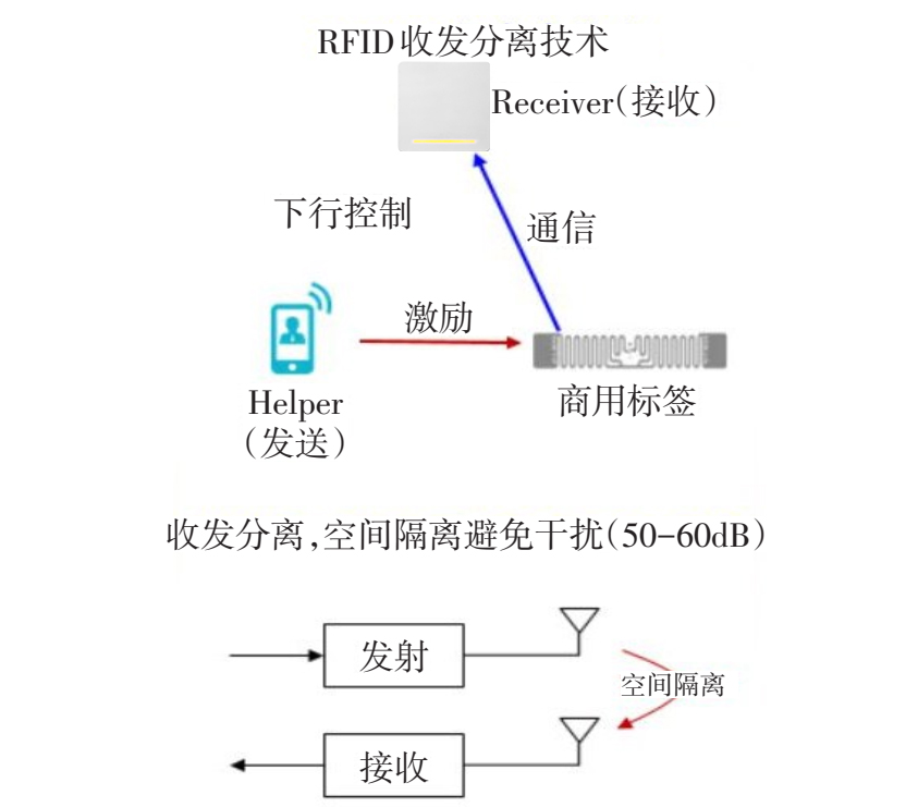 RFID收發(fā)分離技術(shù)是以空間隔離的方式實(shí)現(xiàn)收發(fā)通道分離,在一定的空間內(nèi),RFID激勵(lì)器發(fā)出信號(hào)激勵(lì)RFID標(biāo)簽,接收器采集空間內(nèi)RFID標(biāo)簽被激勵(lì)后發(fā)出的RFID標(biāo)簽信息,這種技術(shù)稱為RFID收發(fā)分離技術(shù)。單個(gè)RFID設(shè)備的收發(fā)分離通過空間隔離的方式,避免了單個(gè)設(shè)備發(fā)送與接收通道間的干擾,同時(shí)將上下行解耦技術(shù)、蜂窩網(wǎng)絡(luò)和頻分調(diào)度技術(shù)應(yīng)用在RFID管理上,解決RFID激發(fā)器和接收器在整個(gè)網(wǎng)絡(luò)上的同步問題。