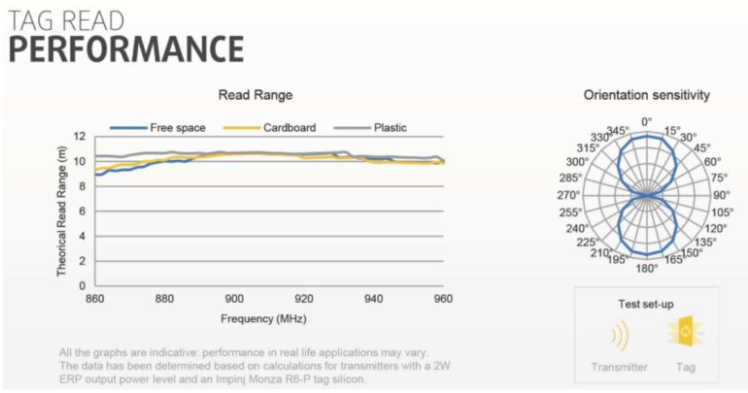 RFID電子標(biāo)簽的射頻性能又能意味著什么呢?從實(shí)際的角度來(lái)看,RFID標(biāo)簽的射頻性能定義了標(biāo)記的可讀范圍(在不同角度當(dāng)標(biāo)簽附加到項(xiàng)目時(shí))。在標(biāo)簽數(shù)據(jù)表中,這些通常用圖表描述。