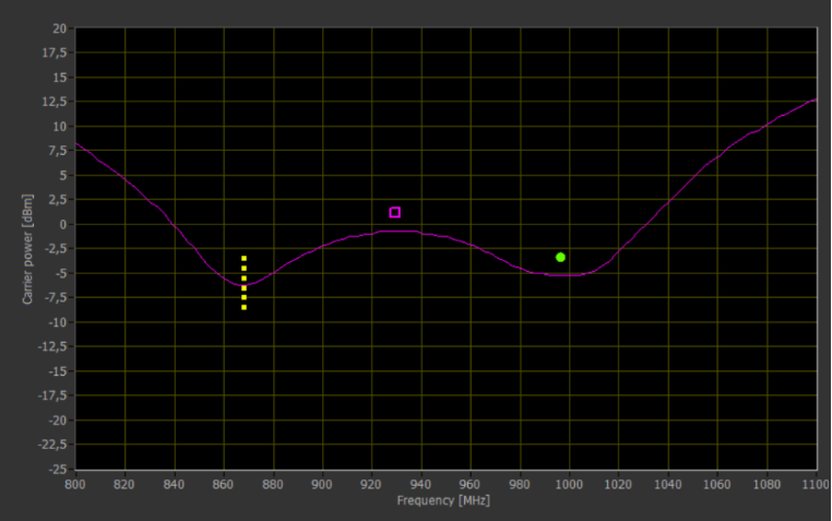 在樣本標(biāo)簽(如上圖)中,兩個(gè)諧振頻率(868MHz和995MHz)都在可用頻率范圍內(nèi)。靈敏度測(cè)試設(shè)置為較低的諧振頻率,點(diǎn)測(cè)試設(shè)置為較高的諧振頻率。由于頻率擴(kuò)展超過(guò)100MHz,因此將第三個(gè)頻率設(shè)置在兩者之間。庫(kù)存測(cè)試設(shè)置為此頻率。在上圖中,該曲線是性能標(biāo)簽的閾值靈敏度曲線(參考)。