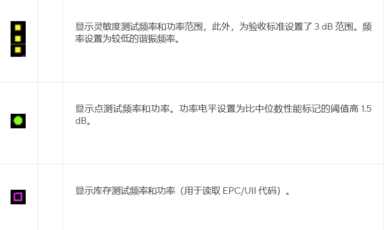 注意:至少其中一點(diǎn)應(yīng)該是庫(kù)存測(cè)試(用于讀取EPC);至少一個(gè)頻率應(yīng)該是靈敏度測(cè)試,上限和下限之間有3dB;應(yīng)設(shè)置點(diǎn)的功率電平,使每個(gè)點(diǎn)中的標(biāo)簽靈敏度在3dB或+/-1.5dB以?xún)?nèi)。
