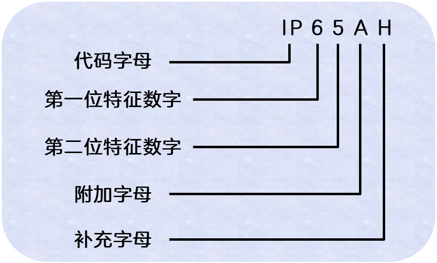 按照IEC529的規(guī)定,IP防護(hù)等級(jí)以IP代碼來表示,IP代碼由代碼字母IP、第1位特征數(shù)字、第2位特征數(shù)字、附加字母和補(bǔ)充字母組成。