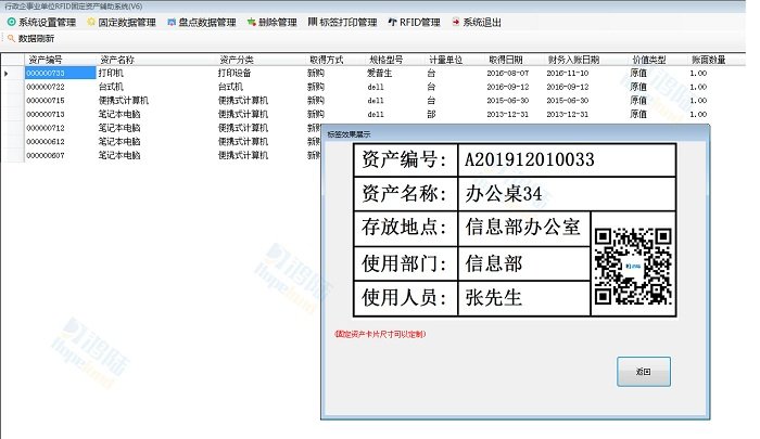 4、有據(jù)可查,選定的固定資產(chǎn)可通過(guò)RFID打印機(jī)錄入標(biāo)簽信息同時(shí),在標(biāo)簽表面打印上標(biāo)簽名稱(chēng)及關(guān)聯(lián)條形碼等相關(guān)信息。