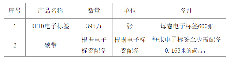 4月15日,江蘇中煙工業(yè)有限責任公司對2024-2026年原料成品RFID電子標簽及配套碳帶(兩年)項目進行國內公開招標,采購清單如下: