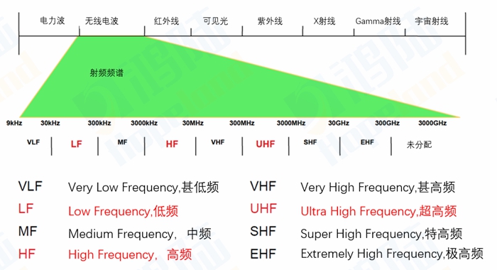 自然界中所有電磁波的頻率從低到高為:電力波、無線電波、紅外線、可見光、紫外線、X射線、Gamma射線)、宇宙射線。其中,與RFID相關(guān)的只是無線電波部分,無線電波顧名思義就是可以輻射到外界的電波。無線電波的頻率范圍從9KHz到300GHz,分成超低頻(VLF)、低頻(LF)、中頻(MF)、高頻(HF)、甚高頻(VHF)、超高頻(UHF)、特高頻(SHF)、極高頻(EHF)。