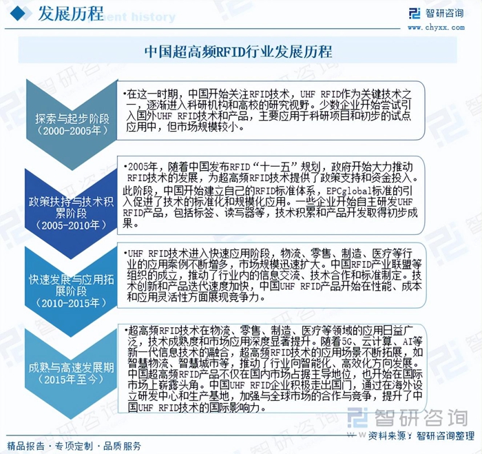 中國(guó)超高頻RFID行業(yè)自2000年起,經(jīng)歷了從探索起步到成熟高速發(fā)展的歷程。初期,技術(shù)引入與初步研究為主,行業(yè)開(kāi)始萌芽。隨后,在政策與標(biāo)準(zhǔn)的推動(dòng)下,技術(shù)積累與產(chǎn)品開(kāi)發(fā)加速,市場(chǎng)初具規(guī)模。進(jìn)入快速發(fā)展與應(yīng)用拓展期,超高頻RFID技術(shù)在多行業(yè)廣泛應(yīng)用,市場(chǎng)規(guī)模迅速擴(kuò)大,中國(guó)產(chǎn)品開(kāi)始展現(xiàn)競(jìng)爭(zhēng)力。