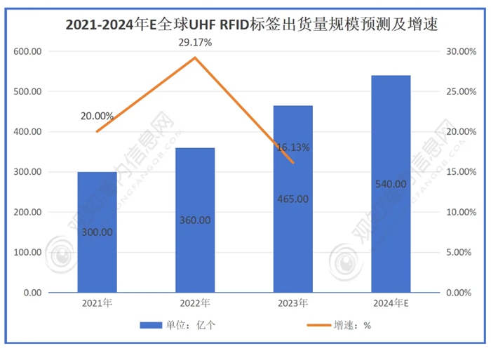 2021年全球UHF RFID標(biāo)簽出貨量為300億個(gè),此后逐年增長(zhǎng)。預(yù)計(jì)到2024年出貨量將達(dá)540億個(gè)。隨著出貨量的不斷增加,反映出超高頻RFID市場(chǎng)規(guī)模逐步擴(kuò)大。這表明該行業(yè)發(fā)展態(tài)勢(shì)良好,市場(chǎng)需求持續(xù)增長(zhǎng),未來(lái)有望繼續(xù)保持增長(zhǎng)趨勢(shì),為各相關(guān)領(lǐng)域的發(fā)展提供有力的技術(shù)支持。