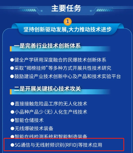 為了推動RFID技術在民爆行業(yè)的應用,《實施意見》提出了以下具體措施: