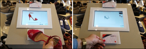巴西鞋店Sapati通過RFID平臺提升了消費者的體驗及門店的銷售額。當(dāng)客戶將鞋子接觸到UHF RFID讀寫器,UHF RFID讀寫器快速識別到該產(chǎn)品,通過其他技術(shù)(如增強現(xiàn)實技術(shù))與RFID配合,在顯示器中顯示出產(chǎn)品信息,提升了消費者的體驗。