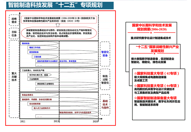 一直以來(lái),智能制造都是科技發(fā)展的重中之重?!笆濉眹?guó)家戰(zhàn)略性新興產(chǎn)業(yè)發(fā)展規(guī)劃、國(guó)家客戶重大專(zhuān)項(xiàng)(02專(zhuān)項(xiàng))、國(guó)家客戶重大專(zhuān)項(xiàng)(04專(zhuān)項(xiàng))、國(guó)家只能制造裝備重大專(zhuān)項(xiàng)及國(guó)家中長(zhǎng)期科學(xué)和技術(shù)發(fā)展規(guī)劃綱要(2006-2020)等相關(guān)政策的頒布,都是體現(xiàn)了國(guó)家對(duì)智能制造行業(yè)發(fā)展的支持及推動(dòng)。