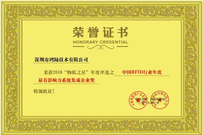 2018中國RFID行業(yè)年度最有影響力系統(tǒng)集成企業(yè):深圳市鴻陸技術有限公司