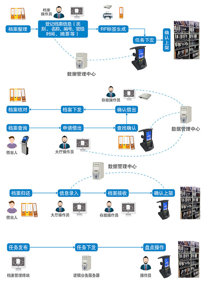 其中,鴻陸超高頻手持終端在整個(gè)RFID系統(tǒng)部署中,有著舉足輕重的作用,可快速實(shí)現(xiàn)檔案存放、借取、歸還及查詢(xún)等工作,具體工作流程如下圖: