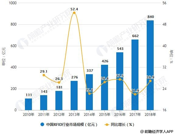 2010-2018年中國(guó)RFID行業(yè)市場(chǎng)規(guī)模統(tǒng)計(jì)及增長(zhǎng)情況預(yù)測(cè)