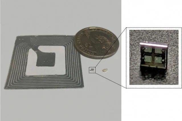 但是,所有這些功能通常需要構(gòu)造一個相當(dāng)大的芯片。因此,研究人員提出了“一種相當(dāng)大的系統(tǒng)集成”。這種集成使得所有東西都放在了一片(不是分層的)硅芯片上,其面積僅約有1.6平方毫米。如下圖所示,盡管只有一粒芝麻種子那么大,這個標(biāo)簽(右側(cè)放大)可以在與大得多的RFID標(biāo)簽(左)媲美的讀寫器距離上進(jìn)行無線通信,并運(yùn)行加密算法幫助保證供應(yīng)鏈中幾乎所有產(chǎn)品的安全。
