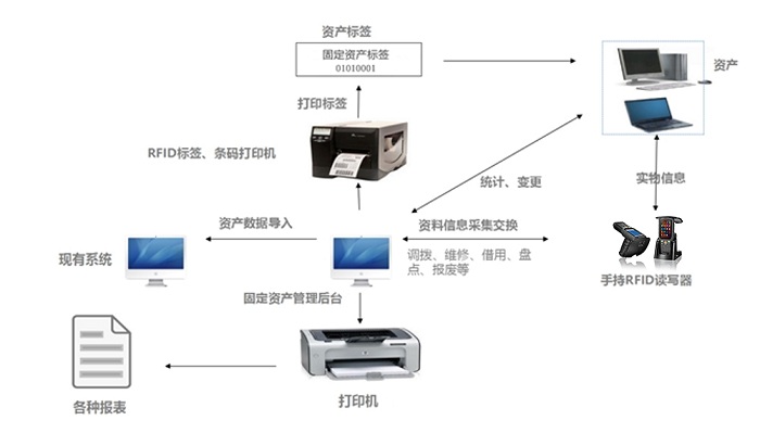 通過采用RFID手持終端設(shè)備對貼在固定資產(chǎn)上的rfid標(biāo)簽(標(biāo)簽事先錄入資產(chǎn)信息)進(jìn)行數(shù)據(jù)采集,最終將數(shù)據(jù)傳輸至rfid固定資產(chǎn)管理系統(tǒng),進(jìn)行數(shù)據(jù)整合、清理、核對、盤點等操作,最終可生成報表。