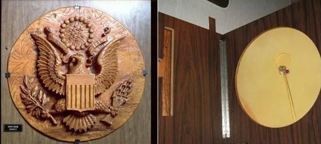 二戰(zhàn)時期,蘇聯(lián)把竊聽裝置“金唇”藏在美國國徽里,利用一群天真無邪的小學(xué)生,把竊聽器送進(jìn)了美國駐俄羅斯大使的辦公室?!敖鸫健睂⒄衲ず吞炀€連接在一起,300米范圍內(nèi)交談的聲音,都會通過振膜引起天線的震動,蘇聯(lián)只需要在對面的樓里,用一個高敏感雷達(dá)照射這根天線,就可以通過天線的震動,還原屋內(nèi)的聲波。