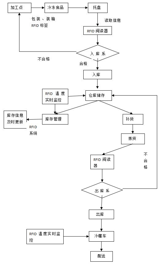 在裝有RFID讀寫器的冷鏈物流倉(cāng)庫(kù),當(dāng)貼有RFID標(biāo)簽的貨物進(jìn)入感應(yīng)區(qū)域時(shí),超高頻讀寫器可以遠(yuǎn)距離同時(shí)識(shí)別多個(gè)標(biāo)簽,并將識(shí)別到的標(biāo)簽內(nèi)信息,通過(guò)網(wǎng)絡(luò)上傳到倉(cāng)儲(chǔ)管理系統(tǒng)。倉(cāng)儲(chǔ)管理系統(tǒng)把貨物數(shù)量、種類等信息與入庫(kù)計(jì)劃進(jìn)行核對(duì),查看是否有誤,同時(shí)系統(tǒng)也會(huì)對(duì)標(biāo)簽內(nèi)記錄的溫度信息進(jìn)行分析,判斷貨物的物流過(guò)程是否安全,貨物檢測(cè)合格后,將合格貨物的收貨時(shí)間及數(shù)量等信息自動(dòng)錄入系統(tǒng)數(shù)據(jù)庫(kù)。倉(cāng)儲(chǔ)系統(tǒng)根據(jù)倉(cāng)位信息安排貨架位置,計(jì)算貨物入庫(kù)搬移距離,并跟蹤貨物,確保貨物放入正確位置。貨物上架后,溫度標(biāo)簽按照預(yù)定設(shè)置周期性的記錄測(cè)量到的溫度,并將溫度數(shù)據(jù)傳遞給倉(cāng)庫(kù)中的鴻陸RFID讀寫器,統(tǒng)一匯總傳到系統(tǒng)數(shù)據(jù)庫(kù),集中管理分析。出庫(kù)時(shí),同樣由RFID閱讀器讀取產(chǎn)品包裝上的RFID標(biāo)簽,由倉(cāng)儲(chǔ)系統(tǒng)與出口計(jì)劃比對(duì),記錄出庫(kù)時(shí)間和數(shù)量。