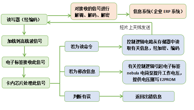 進入讀寫器工作區(qū)域的電子標(biāo)簽接收此信號,卡內(nèi)芯片的有關(guān)電路對此信號進行倍壓整流、調(diào)制、解碼、解密,然后對命令請求、密碼、權(quán)限等進行判斷,電子標(biāo)簽再根據(jù)命令進行處理。