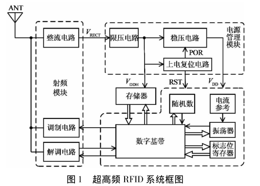 超高頻無源RFID標簽的系統(tǒng)框架如下圖,RFID讀寫器發(fā)射的電磁波由偶極子天線接收,并轉為電信號。因為天線接收的信號幅值較小,只有一百到幾百毫伏,所以該信號不能被直接用來驅動后級電路,必須要經(jīng)過整流電路將電壓整流、倍壓,放大到合適的值。