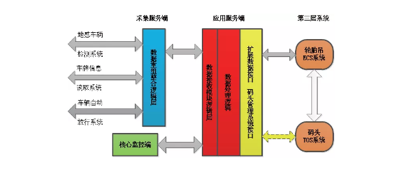 智能堆場(chǎng)RFID自動(dòng)化識(shí)別、道閘系統(tǒng)利用識(shí)別到的車輛信息結(jié)合碼頭運(yùn)營(yíng)管理系統(tǒng)為進(jìn)場(chǎng)作業(yè)提供數(shù)據(jù)比對(duì)、動(dòng)態(tài)地為遠(yuǎn)程核心控制工作人員提供操作信息并對(duì)各種出錯(cuò)信息進(jìn)行報(bào)警和提示。對(duì)于這樣復(fù)雜的系統(tǒng),采用的系統(tǒng)設(shè)計(jì)結(jié)構(gòu)直接決定了系統(tǒng)的穩(wěn)定性、可靠性、實(shí)用性。本系統(tǒng)設(shè)計(jì)采用三層軟件系統(tǒng)架構(gòu),平衡各種硬件設(shè)備和關(guān)聯(lián)系統(tǒng)對(duì)整個(gè)系統(tǒng)的資源利用,最大程度優(yōu)化系統(tǒng)資源,使系統(tǒng)具有靈活性、使用維護(hù)便捷性、運(yùn)行穩(wěn)定性以及良好的開(kāi)放性、靈活的擴(kuò)展性和層次的可伸縮性。