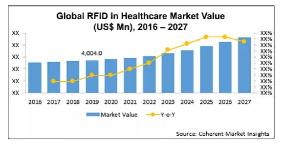 Coherent Market Insights的研究也表明到2027年底,全球醫(yī)療領(lǐng)域RFID市場可能增長至約167.6億美元,年增長率為19.6%。研究表明,RFID技術(shù)跟蹤藥品、醫(yī)療設備、文檔等一切醫(yī)院資產(chǎn)的應用,包括UHF和HF無源標簽系統(tǒng)的應用,正受到多種因素的推動。該公司發(fā)現(xiàn),假藥盛行、患者安全問題、提高效率的需求以及開發(fā)更有效、更實惠的技術(shù),這些因素一起推動了預期的增長。