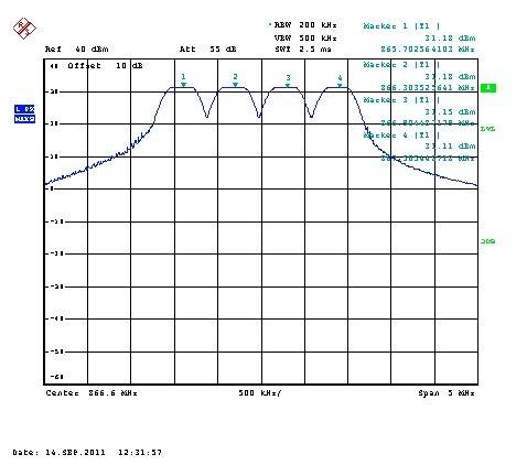 下面針對一款掃描機(jī)的測試進(jìn)行介紹,該產(chǎn)品調(diào)制方式為ASK,功率為30±3dBm,有效工作頻點(diǎn)為:865.7MHz,866.3MHz,866.9MHz,867.5MHz。