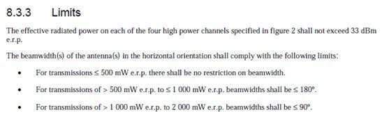 3、1000mW至2000mW erp的,其發(fā)射機(jī)射束帶寬不超過90°。