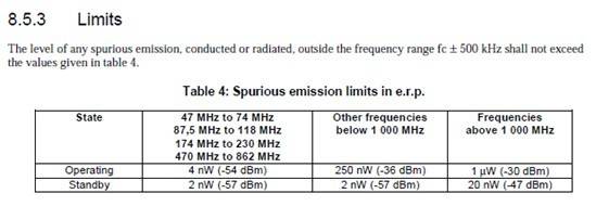雜散發(fā)射的測試需要測試工作模式與待機(jī)模式,其限值有所不同,如下圖所示: