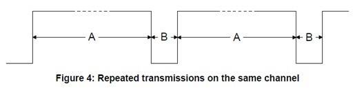 定義為發(fā)射機(jī)持續(xù)發(fā)射的周期時間,目的是驗(yàn)證是否其在有效的進(jìn)行發(fā)射。通過驗(yàn)證產(chǎn)品的持續(xù)發(fā)射時間與停止發(fā)射的時間,來判斷其是否符合標(biāo)準(zhǔn)中的要求。持續(xù)發(fā)射時間A不能大于4S,發(fā)射間隙B不能小于100ms。