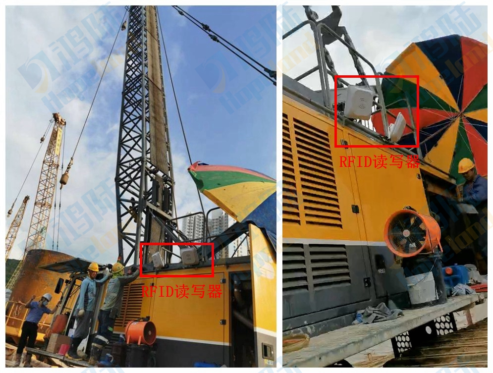 2、在工程車上安裝鴻陸RFID讀寫器及自動(dòng)報(bào)警燈,當(dāng)人員經(jīng)過(guò)工程車安全范圍時(shí),RFID讀寫器會(huì)自動(dòng)讀取周圍人員安全帽RFID標(biāo)簽信息;