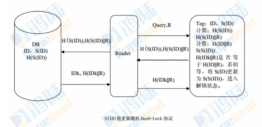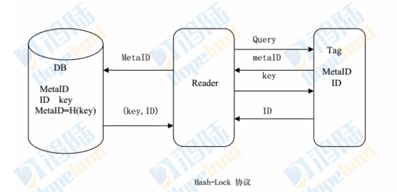 Hash-Lock協(xié)議是為了避免信息泄露和被追蹤,使用metaID來代替真實(shí)的RFID標(biāo)簽ID。其流程如下圖: