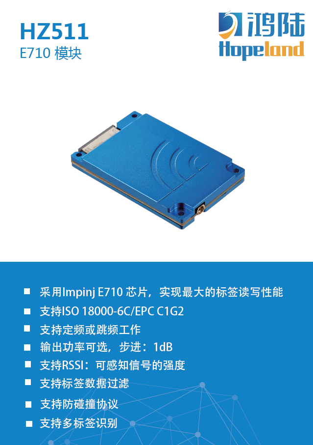 鴻陸最新研發(fā)E710芯片模塊 鴻致511采用Impinj E710 芯片;支持ISO 18000-6C/EPC C1G2;支持定頻或跳頻工作;輸出功率可選,步進(jìn):1dB;支持RSSI:可感知信號(hào)的強(qiáng)度;支持標(biāo)簽數(shù)據(jù)過(guò)濾、防碰撞協(xié)議及多標(biāo)簽識(shí)別。