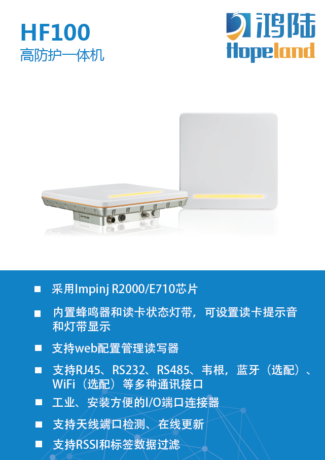 鴻陸最新研發(fā)的高防護(hù)遠(yuǎn)距離一體機(jī) 鴻鋒100采用Impinj R2000/E710芯片;內(nèi)置蜂鳴器和讀卡狀態(tài)燈帶,可設(shè)置讀卡提示音和燈帶顯示;支持web配置管理讀寫(xiě)器;支持RJ45、RS232、RS485、韋根,藍(lán)牙(選配)、WiFi(選配)等多種通訊接口;工業(yè)、安裝方便的I/O端口連接器;支持天線端口檢測(cè)、在線更新;支持RSSI和標(biāo)簽數(shù)據(jù)過(guò)濾。