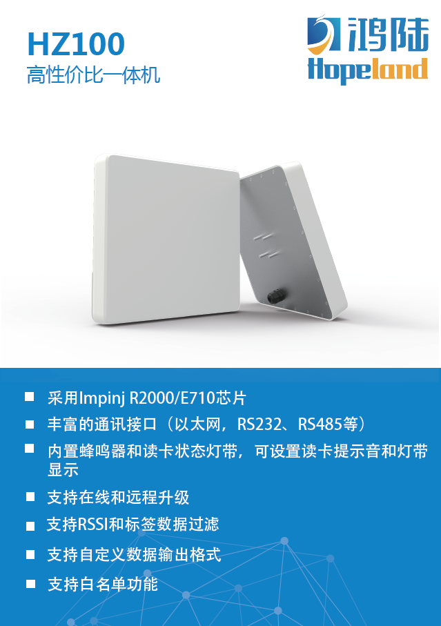 鴻陸最新研發(fā)高性?xún)r(jià)比一體機(jī) 鴻致100采用Impinj R2000/E710 射頻方案實(shí)現(xiàn)超預(yù)期的讀卡性能,滿(mǎn)足各種應(yīng)用場(chǎng)景;完全自主知識(shí)產(chǎn)權(quán)設(shè)計(jì);具有豐富的通訊接口(以太網(wǎng),RS232、RS485等);內(nèi)置蜂鳴器和讀卡狀態(tài)燈帶,可設(shè)置讀卡提示音和燈帶顯示;支持在線和遠(yuǎn)程升級(jí)、RSSI和標(biāo)簽數(shù)據(jù)過(guò)濾、自定義數(shù)據(jù)輸出格式、白名單功能。